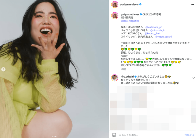 「年々キレイになってる」ゆりやん、大人気ヘア&メイクアップアーティスト・小田切ヒロによる“多幸感メイク”で別人級激変「女度が急上昇」 ピンズバNEWS編集部 2026.3.2 お笑い エンタメ (2/2ページ) 1ページ目から読む ■【画像】「年々キレイになってる」ゆりやん、大人気ヘアメイクの“多幸感メイク”で別人級激変 大人気ヘアメイク・小田切ヒロ氏にメイクをされたゆりやんの《年々キレイになってる》《最近女度が急上昇》という声が上がった今回の投稿。活躍に比例するように魅力もアップし続けるゆりやんから目が離せない。 ※画像はゆりやんレトリィバァのインスタグラムより この画像の記事を読む 1 2