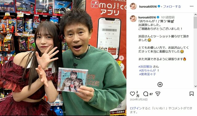 黒嵜菜々子が『サンジャポ』で“未成年飲酒疑惑”発言し釈明も…疑い晴れぬ背景に「20歳になった1週間後のSNS投稿」 ピンズバNEWS編集部 2026.3.3 女性アイドル (3/3ページ) 1ページ目から読む ■【画像】”未成年飲酒疑惑”の黒嵜菜々子がダウンタウン浜田と、肩出し・腹出し衣装で超密着2ショット 24年3月、浜田雅功(62)の冠番組『浜ちゃんが!』(読売テレビ)に出演した際、浜田との2ショットを披露していた黒嵜菜々子。 ※画像は黒嵜菜々子のインスタグラムより この画像の記事を読む 1 2 3