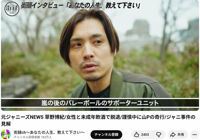 アイドルグループ・NEWSの元メンバーで現在は俳優として活動する草野博紀(38)が2月28日公開のYouTubeチャンネル『街録ch~あなたの人生、教えてください~』に出演。現在の姿を見たファンからは、《いい顔してる》《目元の並んだホクロ健在でなんか嬉しい》といったコメントが寄せられた。