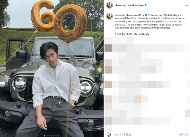 「20代に見える」SNSフォロワー数185万人超え“世界一若見え”のイケオジが60歳誕生日「信じられない」 ピンズバNEWS編集部 2026.3.5 エンタメ 俳優 (2/2ページ) 1ページ目から読む ■【画像】「20代に見える」60歳を迎えた奇跡のイケオジ、爆イケ白シャツ姿 《20代に見える》《信じられない》との声まで上がっているチュアンドさんの60歳誕生日報告。彼が年相応のルックスになる日は来るのだろうか。 ※画像はチュアンド・タンさんのインスタグラムより この画像の記事を読む 1 2