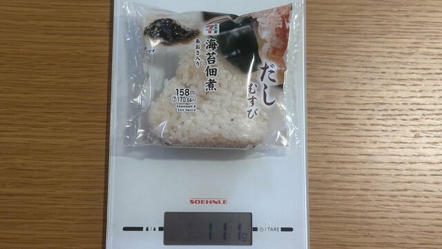 まずは「だしむすび のり佃煮」。普段158円(税込170.64円)がセールにより100円(税込108円)になる。海苔がないタイプで、重さは包装込みで111グラム、1個あたりのカロリーは181kcalだ。