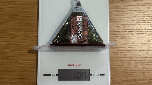 続いて、セールにより150円(税込162円)になった「鶏そぼろ」198円(213.84円)。重さは包装込みで107グラム、1個あたりのカロリーは199kcalだ。