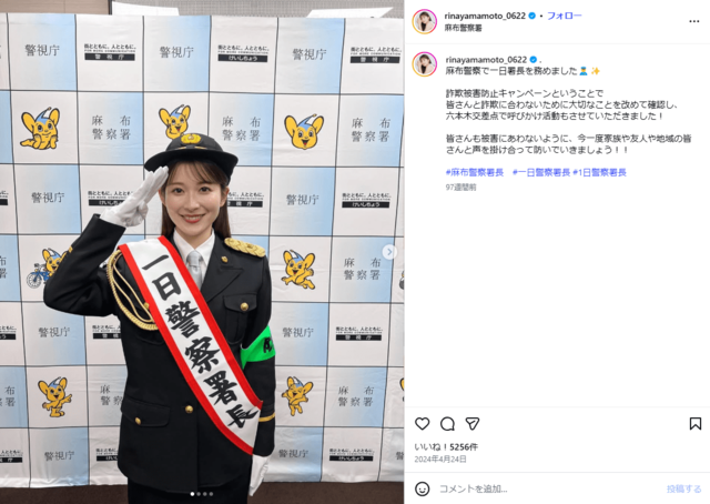 「詐欺被害防止キャンペーン」の一環として麻布警察署で一日署長を務めたのは、元TBSの山本里菜アナウンサー。《六本木交差点で呼びかけ活動もさせていただきました! 皆さんも被害にあわないように、今一度家族や友人や地域の皆さんと声を掛け合って防いでいきましょう!!》とのコメントに、フォロワーも《こんな素敵な警察官いたら悪いことできないよぅ》と反応。かわい過ぎると話題になった。