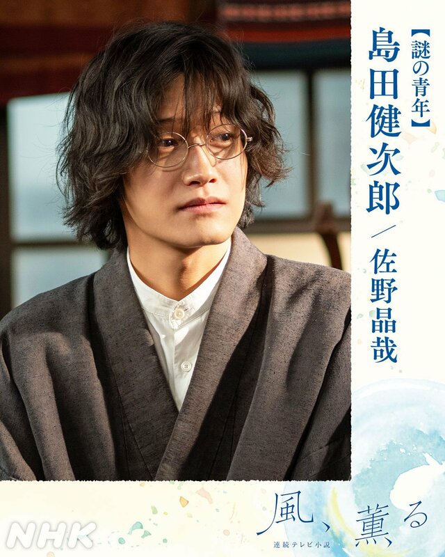 Aぇ!groupの佐野晶哉は、明治時代が舞台の朝ドラ『風、薫る』にメインキャストの1人、島田健次郎役で出演する。肩書は「謎の青年」ということだが、「新しく生まれた言葉や外国語に造詣が深い」というプロフィール、無造作な髪型やメガネなどから、小説家や文学青年などでは、と考えるファンは多い。解禁された、意味深な表情を浮かべるビジュアルは好評で《明治の時代にびったりな風貌》《令和アイドルの中で誰よりも文豪》などと注目を集めている。