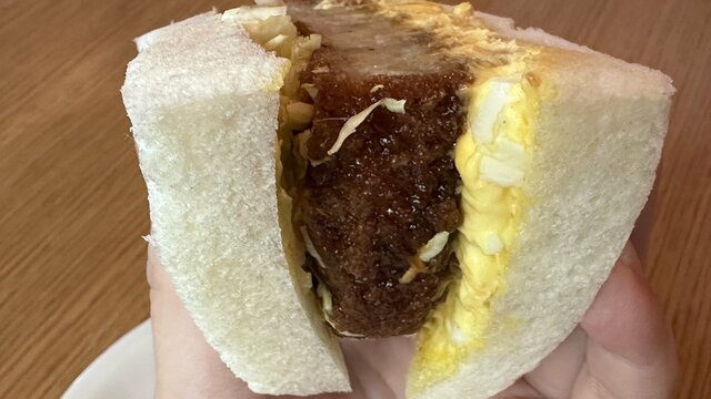 そして、X上でも《後ろには具材ないんでしょ?》と話題になっていた新商品の『メンチカツ&たまご』(213円)。たまご、メンチカツ、千切りキャベツが2枚のパンで挟まれているサンドイッチが1つ入った商品だ。