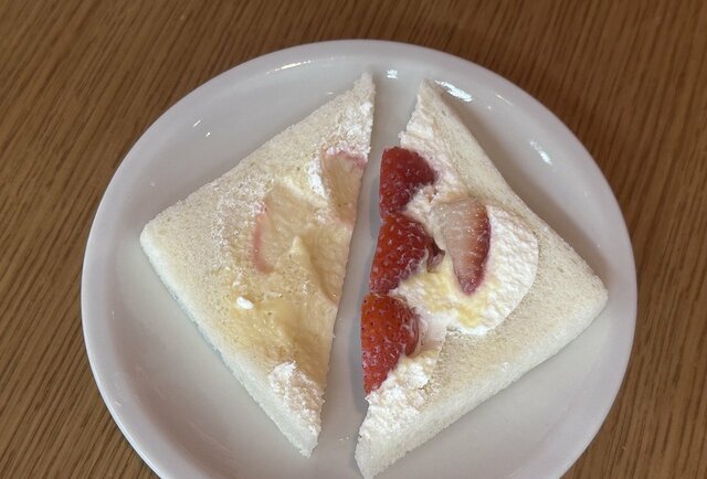 コンビニサンドの鉄板ともいえる「いちご」は素材の価格代もあり、2個で税込507円と三角サンドのラインナップのなかでは最高額。カロリーは239キロカロリー。パンを開いてみると、2分の1のいちごが3つと4分の1ぐらいのいちごが1つ断面寄りに入っていた。パンはふんわりしたかもしれないが、クリームは若干の物足りなさが残る。