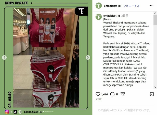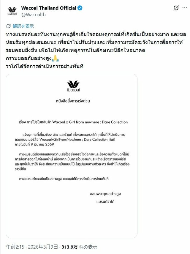 タイの『ワコール』広告が炎上、“女子高生がスカートめくり”人気ドラマとコラボも 謝罪→即撤去の騒動に発展 ピンズバNEWS編集部 2026.3.13 エンタメ (3/3ページ) 1ページ目から読む ■【画像】ワコールが人気ドラマとコラボ、大炎上した「女子高生のスカートめくり下着見せ」広告 タイのワコール社が手掛けたコラボ広告に疑問を呈したポストは、3月8日16時59分にXに投稿されて以来大きな議論を呼び、3月12日17時までに921.9万件の表示と広く注目を集めている。 ※画像はXより ※画像はタイ情報を伝えるアカウント「enthaisiast_id」の公式インスタグラムより ※画像はタイワコール社の公式Xより この画像の記事を読む 1 2 3