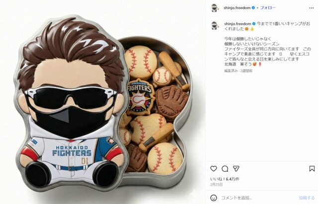 日本ハムの新庄剛志監督は、自身の公式インスタグラムで《今までで1番いいキャンプがおくれました 今年は優勝したいじゃなく 優勝しないといけないシーズン ファイターズ全員が同じ方向に向いてます》と報告。画像として投稿したクッキー缶のデザインは、まるでフジテレビ系の人気番組『逃走中』のハンターのようだ。