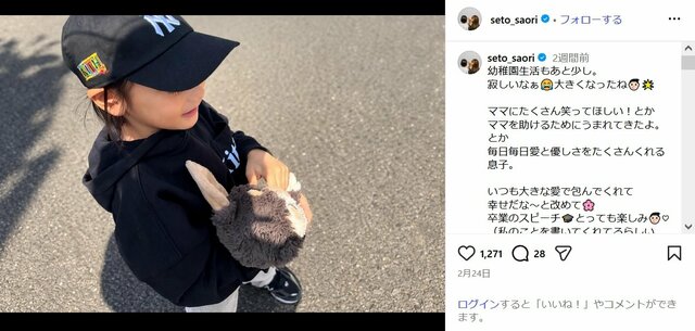 夫である斉藤被告が不同意性交と不同意わいせつ罪により在宅起訴された生活のなか、妻の瀬戸サオリは、今年再始動させたインスタグラムにて、《ママにたくさん笑ってほしい!とか ママを助けるためにうまれてきたよ。とか 毎日毎日愛と優しさをたくさんくれる息子。》と、6歳の息子の存在に助けられていることをつづった。息子には、《まつげフサフサ》《すくすく成長、そして既にイケメンの兆し》などと称賛が寄せられている。