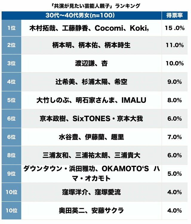そして第1位(15.0%)は、「木村拓哉、工藤静香、Cocomi、Koki,」親子。