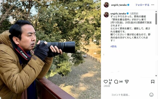 「思ってる方向とは違うかなと」アンガールズ・田中卓志がフジ冠番組終了で涙の本音激白 現場vs編成も…テレビ局の内部事情 ピンズバNEWS編集部 2026.3.17 テレビ&ラジオ お笑い エンタメ (3/3ページ) 1ページ目から読む ■【画像】アンガ田中、テレビとは全く違う超真剣姿にファン驚き「スナイパーの目」 アンガールズ・田中卓志は“多趣味芸人”だが、バードウォッチングにもハマっていることで知られる。野鳥をカメラで超真剣に覗く姿には《スナイパーの目》なんて声も。その熱中ぶりから特番『野鳥を観る田中』(BSテレ東)が放送されたこともある。 ※画像は田中卓志の公式インスタグラムより この画像の記事を読む 1 2 3