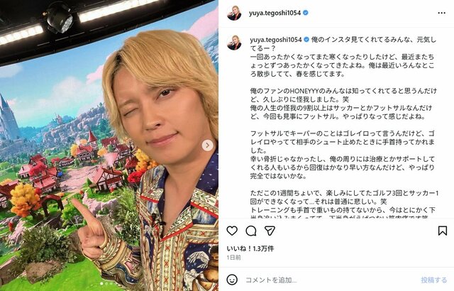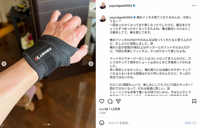 元NEWSで歌手の手越祐也(38)が3月16日、インスタグラムを更新。フットサルで負傷した手首の写真を公開すると、《手越くん手の怪我大丈夫ー?》《骨折じゃなくてよかったけど心配だよ》といった心配の声が寄せられた。さらにウインクした自撮りショットも投稿し、王子キャラを炸裂させていた。