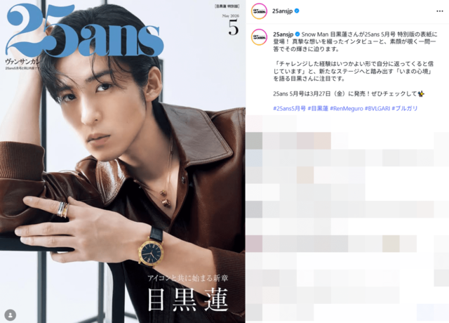 女性ファッション誌『25ans(ヴァンサンカン)』(ハースト婦人画報社)の公式インスタグラムで19日までに、Snow Man・目黒蓮の表紙カットを解禁。以前よりほっそりした首元がのぞく色気倍増ビジュに《めめ、また痩せた?》《どんだけ表情の種類持ってるん》《何となく憂いを感じる表情がめちゃくちゃ素敵……》《いつにも増して品がある目黒さん》など、さまざまな反応を呼んだ。現在は、多忙を極める中オーディション挑戦で見事に勝ち取った『SHOGUN 将軍』シーズン2の“和忠(かずただ)”役の撮影のため、カナダに長期滞在している。
