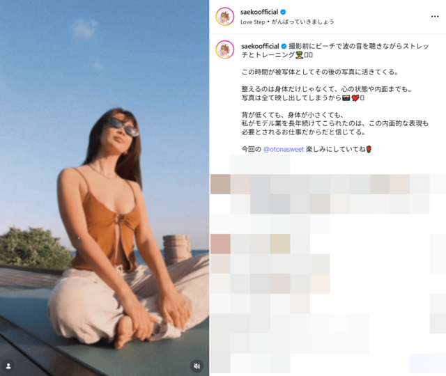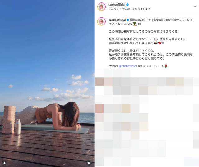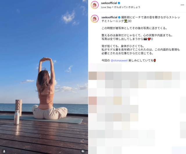 紗栄子・39歳、沖縄のビーチでトレーニング姿が「綺麗なウエスト」沸騰 “内面から輝く美貌”にうっとり ピンズバNEWS編集部 2026.3.22 エンタメ (2/2ページ) 1ページ目から読む ■【画像】「綺麗なウエスト」紗栄子39歳、沖縄のビーチでトレーニング姿がまぶしい ファンからあがった《綺麗なウエスト》など美しさを評価する声は、単に見た目だけなのではなく、紗栄子いわく”内面から輝く美貌”ありきのビジュアルなのだそうだ。 紗栄子のインスタグラムより、以下同 この画像の記事を読む 1 2