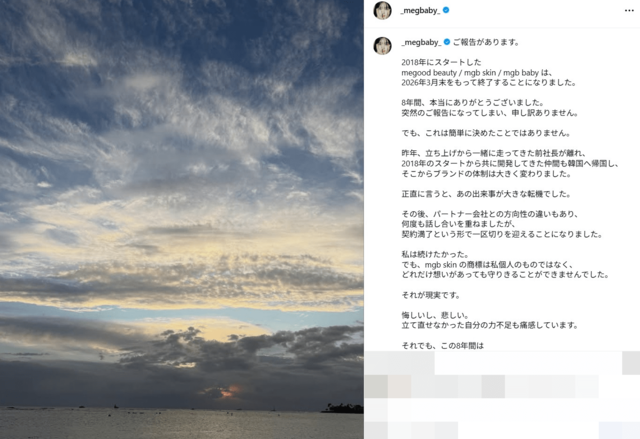 《あの出来事が大きな転機でした》とブランド終了報告とともに意味深発言をしたMEGBABY。そんなMEGBABYの投稿には《衝撃すぎて言葉がありません。ずっと使い続けてきたものがなくなるなんて…》とファンからも落胆の声も上がっているが、また違ったかたちでファンを喜ばせてくれることだろう。
