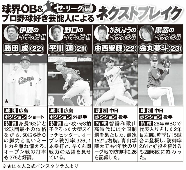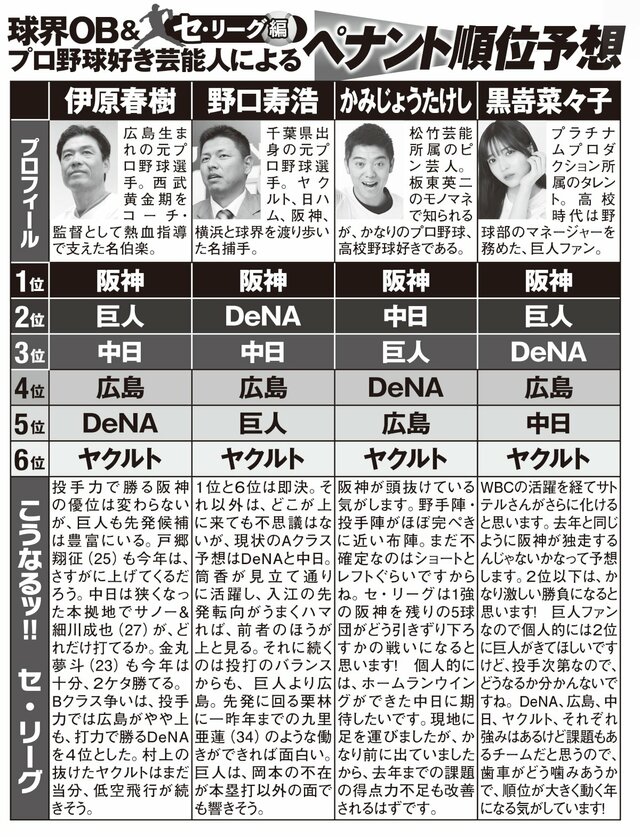 阪神OB野口寿浩&元巨人コーチ伊原春樹が徹底解説、開幕目前ペナントレース予想【セ・リーグ編】 ピンズバNEWS編集部 2026.3.26 野球 (5/5ページ) 1ページ目から読む ■【画像】球界OB&プロ野球好き芸能人による「ペナント順位予想」セ・リーグ編 球界OBとプロ野球が好きな著名人による今季の順位予想。どのチームが優勝するか。 画像作成/編集部 画像作成/編集部 この画像の記事を読む <開幕目前>ペナントレース予想2026 日ハムOB野口寿浩&元西武監督・伊原春樹が徹底解説、開幕目前ペナントレース予想【パ・リーグ編】 1 2 3 4 5