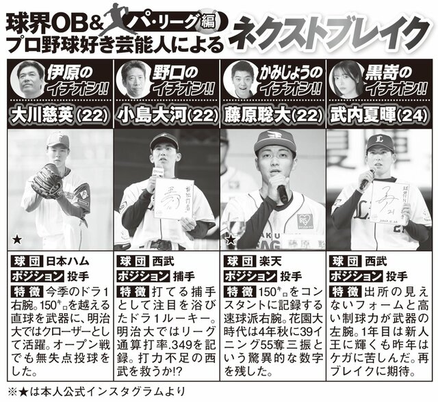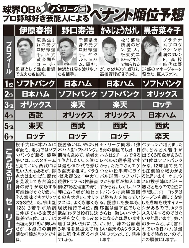 日ハムOB野口寿浩&元西武監督・伊原春樹が徹底解説、開幕目前ペナントレース予想【パ・リーグ編】 ピンズバNEWS編集部 2026.3.26 野球 (3/3ページ) 1ページ目から読む ■【画像】球界OB&プロ野球好き芸能人による「ペナント順位予想」パ・リーグ編 球界OBとプロ野球が好きな著名人による今季の順位予想。どのチームが優勝するか。 画像作成/編集部 画像作成/編集部 この画像の記事を読む <開幕目前>ペナントレース予想2026 阪神OB野口寿浩&元巨人コーチ伊原春樹が徹底解説、開幕目前ペナントレース予想【セ・リーグ編】 1 2 3