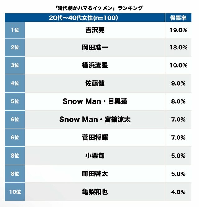 「映画『キングダム』シリーズで始皇帝を演じたし、端正な顔立ちが時代劇で映えると思う」(47歳/女性/主婦)