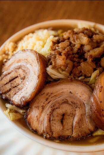 東洋大学在学中に二郎系ラーメン店でアルバイトをしていたという猪爪雅也さん。そんな猪爪さんがガーナで提供しているという二郎系ラーメンは1杯日本円でおよそ2800円だ。日本ではすりおろしたニンニクが麺の上にのっている二郎系ラーメンだが、猪爪さんが作る二郎系ラーメンはフライドガーリックがのっかっていたり、辛口メニューが準備されていたりと、基本的な二郎系ラーメンのルールは踏襲しながらも“ガーナ風”にアレンジが加えられている様子も伺える。
