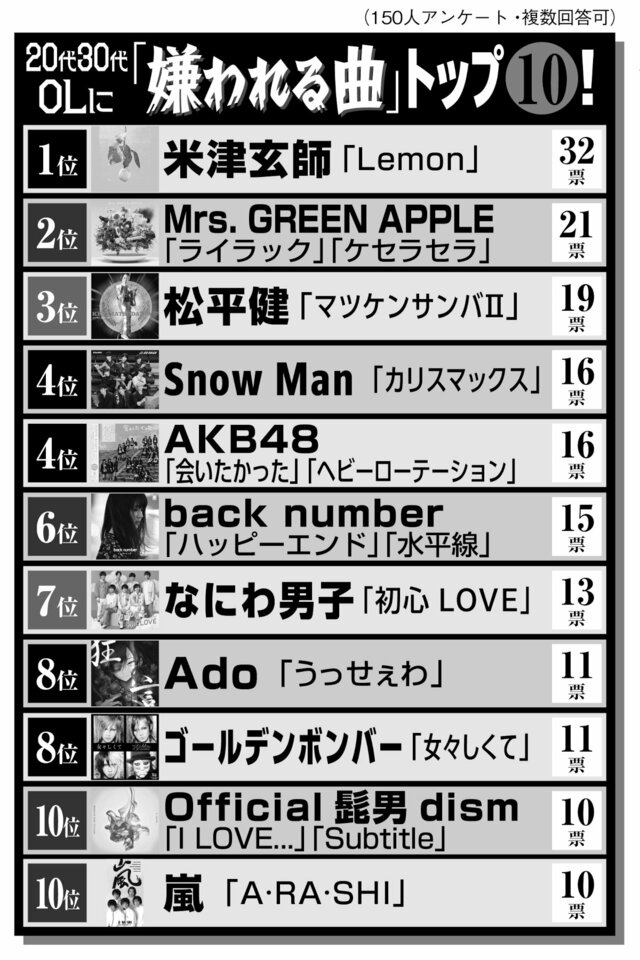 【歓迎会シーズン】『マツケンサンバ』は超危険、AKB48にも気を付けろ 50代以上の男性がカラオケで嫌われる曲トップ10 ピンズバNEWS編集部 2026.4.2 ライフ 仕事 (3/3ページ) 1ページ目から読む ■【画像】20代30代のOLに「嫌われる曲」一覧 本サイトが徹底調査カラオケで歌うと20代、30代のOLに嫌われる曲はこれだ。 画像作成/編集部 この画像の記事を読む 【春の宴会講座】おじさんがカラオケで嫌われる曲・喜ばれる曲トップ10 米米CLUBの『浪漫飛行』、サザンは選曲に要注意 若者にも好感度「大」50代以上の男性がカラオケで喜ばれる曲トップ10 「今はM!LKを歌っておけばハズさない」ガールズバー店員の本音“50代以上男性のカラオケ作法” 1 2 3