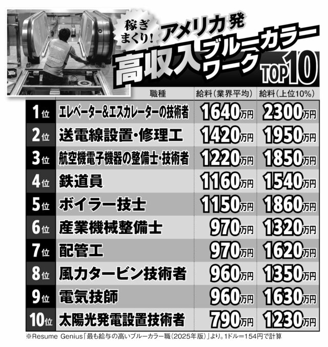 アメリカで始まった“ガテン系”給与革命は日本にも波及、タクシー運転手で年収1000万 ブルーカラービリオネア時代 ピンズバNEWS編集部 2026.4.3 マネー 仕事 (3/3ページ) 1ページ目から読む ■【画像】アメリカ発「高収入ブルーカラーワークTOP10」 アメリカで稼げるブルーカラーの職業トップ10はこれだ。 画像作成/編集部 この画像の記事を読む 衝撃革命進行中「ガテン系所得倍増時代」到来!! とび職は「日給5万円」「電気工事士」は月給100万円超、ガッポリ儲かる“ガテン系”職業 トップ7 1 2 3