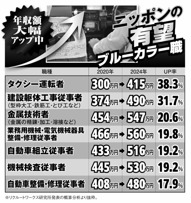 とび職は「日給5万円」「電気工事士」は月給100万円超、ガッポリ儲かる“ガテン系”職業 トップ7 ピンズバNEWS編集部 2026.4.3 マネー 仕事 (4/4ページ) 1ページ目から読む ■【画像】ニッポンの「有望ブルーカラー職」一覧 ニッポンの有望ブルーカラー職はこれだ。 画像作成/編集部 この画像の記事を読む 衝撃革命進行中「ガテン系所得倍増時代」到来!! アメリカで始まった“ガテン系”給与革命は日本にも波及、タクシー運転手で年収1000万 ブルーカラービリオネア時代 1 2 3 4