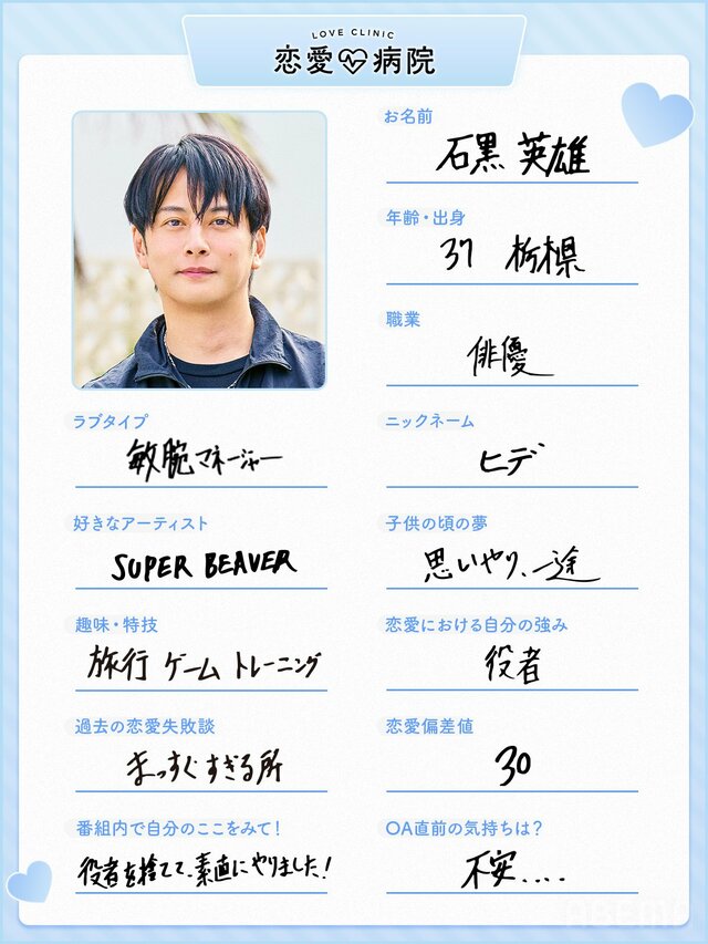 テレビドラマ『ごくせん』シリーズ(日本テレビ系)でメインキャストとして出演した俳優・石黒英雄(37)がABEMAの恋愛リアリティーショー『恋愛病院』(4月2日より放送スタート)に出演すると発表された。同番組のSNSで現在のビジュアルが公開されると、ファンからは《37歳には見えない。良すぎる》《相変わらずイケメン》といったコメントが寄せられた。