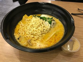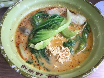 本場四川の麻辣湯は辛すぎて中国人でも食べられたものではないようだ。現在、広く親しまれている牛骨ベースの麻辣湯は中国の東北部、ハルビンや大連でアレンジされたものだ。写真は阿生氏が上海留学中に食べたという麻辣湯。本場はスープが真っ赤だ。