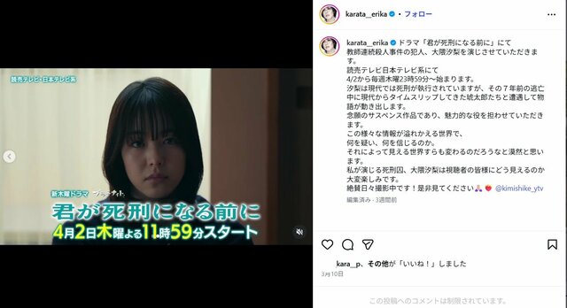 唐田えりかは2026年4月期には、水曜放送の『102回目のプロポーズ』と木曜放送の『君が死刑になる前に』――曜日が連続するドラマにメインキャストとして出演している。前者では清純派の美人音楽家、後者では、不気味な死刑囚。役の幅には《落差エグい》などの声も。