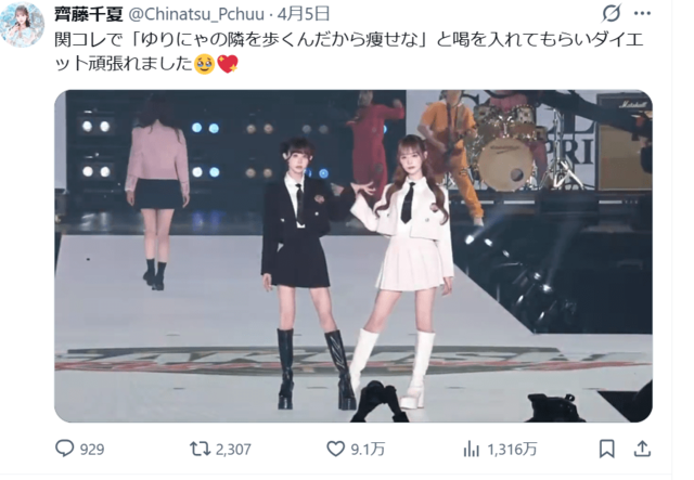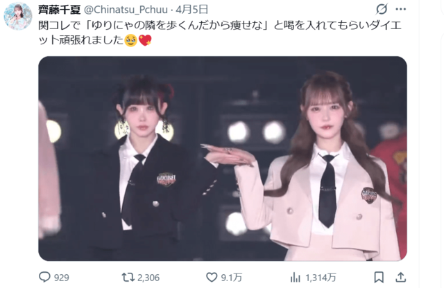 “ウエスト47.6cm”ゆりにゃ、プロデュースを手がけるアイドルへの発言が賛否沸騰 「ゆりにゃの隣を歩くんだから痩せな」 ピンズバNEWS編集部 2026.4.7 女性アイドル アーティスト エンタメ (2/2ページ) 1ページ目から読む ■【画像】「ゆりにゃの隣を歩くんだから痩せな」発言で物議のゆりにゃと齊藤千夏、スレンダーボディが際立つランウェイ姿 ゆりにゃが齊藤千夏に放った《ゆりにゃの隣を歩くんだから痩せな》の言葉にさまざまな反響が寄せられているが、齊藤の努力の甲斐もあってかファッションショーのステージは大いに盛り上がったようだ。 ※画像は齊藤千夏のXより、以下同 この画像の記事を読む 1 2