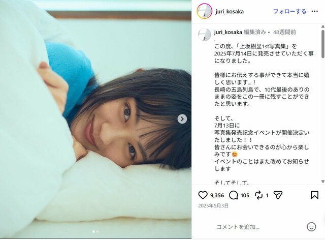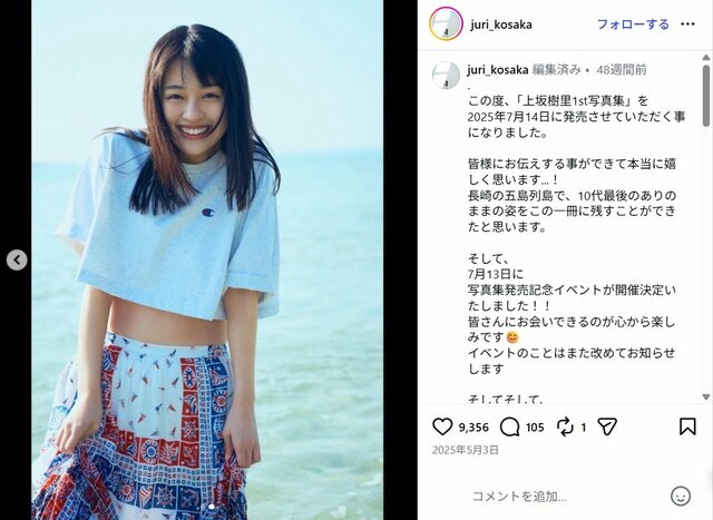 NHK連続テレビ小説『風、薫る』で見上愛とダブル主演を務める上坂樹里。彼女は20歳の誕生日を迎えた2025年7月14日に、“10代最後のありのままの姿”を収めた1st写真集『日日是好日』をリリース。海がきれいな長崎県の五島列島を舞台に、等身大の無邪気な表情、思いっ切り羽目を外した姿などを収めた写真集である。細いウエストがあらわなショットではスタイルの良さを感じさせる。