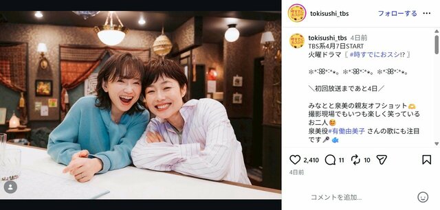 永作博美主演の新TBS系火曜ドラマ『時すでにおスシ!?』に主人公の親友役で出演しているフリーアナウンサー・有働由美子。本格的な俳優業は初めてだが自然な演技力を見せたほか、永作とスナックで飲む場面も。大女優・永作と並んでも負けない小顔ぶりには《美女だらけ》《女優二人?》などの声も。