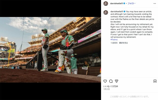 ダルビッシュ有のインスタグラムに英文で投稿されたコメント。インスタグラムの翻訳では、《パドレスとの契約を無効にする方向に傾いています》としたうえで、《詳細は未定》と報告。気になる引退については《私はまだ引退を発表しない。今は肘のリハビリに全集中していて、また投げられるところまで来たら、またゼロからやり直して勝負します。一度そこまで来たら、それができないと感じたら、引退を発表します》と結んでいる。