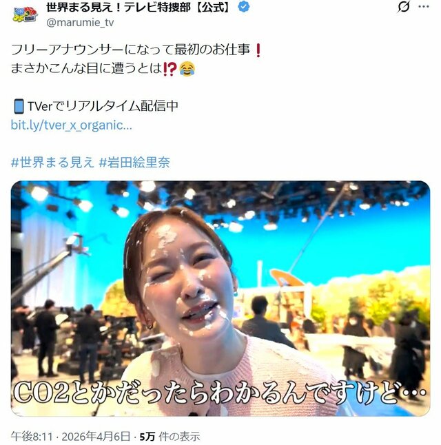 日テレ退社の岩田絵里奈、ビートたけしから“クリーム砲”の洗礼に驚き 「臭いしベトベト」明かした舞台裏 ピンズバNEWS編集部 2026.4.8 女子アナ テレビ&ラジオ エンタメ (2/2ページ) 1ページ目から読む ■【画像】「本当にびっくり!」岩田絵里奈、顔面にクリーム砲を浴びた貴重なシーン 着替え後のジャージ姿も 3月末をもって日本テレビを退社してフリーアナウンサーに転身した岩田絵里奈(30)が、4月6日放送の『世界まる見え!テレビ特捜部』(日本テレビ系)に出演。スペシャルパネリストのビートたけしからまさかの洗礼を受け、絶叫する一幕があった。 ※画像は『世界まる見え!テレビ特捜部』(日本テレビ系)の公式Xより(以下同) この画像の記事を読む 1 2