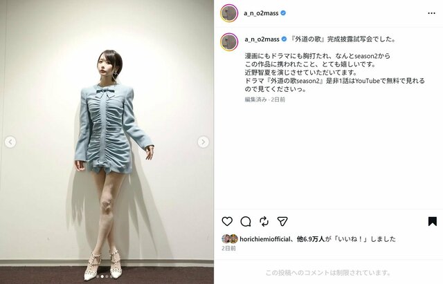 DMM TV オリジナルドラマ『外道の歌 SEASON2』(4月9日配信スタート)の完成披露試写会が4月6日に開催された。同イベントに出席した歌手・タレントの“あのちゃん”こと、あの(年齢非公表)が着用していたドレスが高級ブランド『ヴァレンティノ』のアイテムではないかとネット上で話題になっており、《70万?》と衝撃の価格に驚きの声が上がっている。