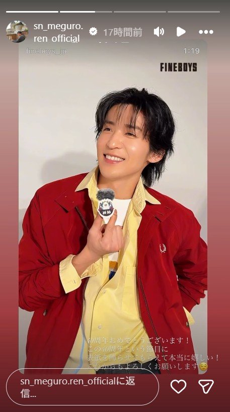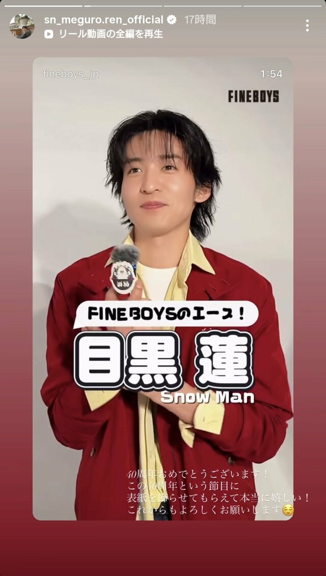 SnowManの目黒蓮が4月9日発売のメンズファッション誌『FINEBOYS』創刊40周年・5月号で表紙を飾り、40周年記念メッセージ動画も公開された。