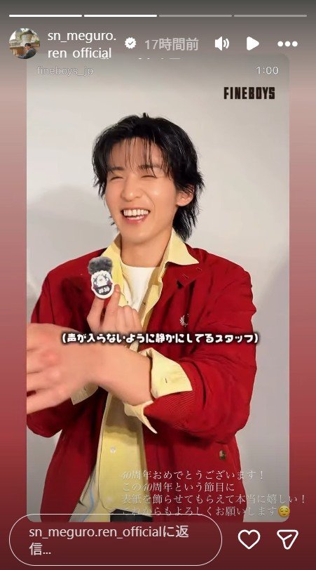 今回の目黒の服装は、白インナーにレモンイエローのシャツと赤いブルゾン。髪型はシースルーバング(※おでこがほんのり透けて見える前髪)に、長めの襟足を外ハネにセット。普段の目黒の雰囲気とは少し違う新鮮なビジュアルだ。スタッフを相手に楽しそうにコメントしていることも含めて《髪の毛神ってるビジュ最高》《FINEBOYSだからこそ、こんなに引き出せるめめのでへへな笑顔》といった声が多く寄せられている。