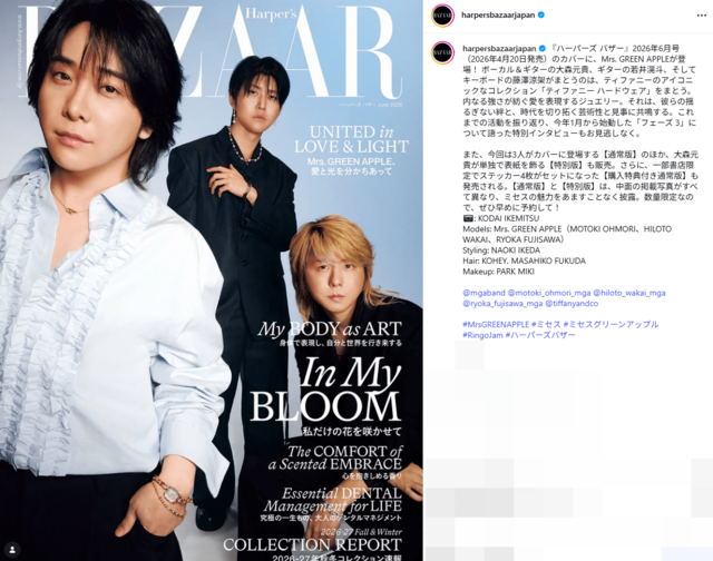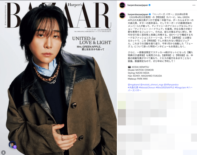 Mrs. GREEN APPLE大森元貴、前髪ありで気だるげな表情の“モデル仕様”ソロ表紙が沸騰「いつもと違う感じ」 ピンズバNEWS編集部 2026.4.11 アーティスト エンタメ (2/2ページ) 1ページ目から読む ■【画像】「いつもと違う感じ」大森元貴、前髪ありで気だるげな表情の“モデル仕様”ソロ表紙 前髪ありで気だるげな表情を見せる“モデル仕様”ソロ表紙が《いつもと違う感じ》と沸騰中のミセス大森元貴。雑誌の特色がにじみ出るそれぞれの“味付け”が何ともおもしろい。 ※画像は『Harper’s BAZAAR』(ハースト婦人画報社)公式インスタグラムより、以下同 この画像の記事を読む 1 2