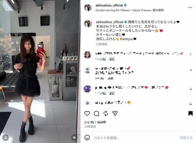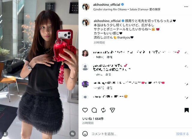 ほしのあき、流行の髪型で“軽やかイメチェン”姿公開 「164cm・43kg」超ミニ丈のブラックコーデに反響 ピンズバNEWS編集部 2026.4.14 アーティスト エンタメ (2/2ページ) 1ページ目から読む ■【画像】ほしのあき、トレンドヘアで軽やかイメチェン 「164cm・43kg」超ミニ丈のブラックコーデ公開 タレント・モデルのほしのあき(49)が4月13日、インスタグラムを更新。軽やかイメチェンショットを公開すると、ファンから《髪の毛の色は何色ですか?》《良い感じです》など絶賛の声が寄せられた。 ※画像はほしのあきの公式インスタグラムより(以下同) この画像の記事を読む 1 2