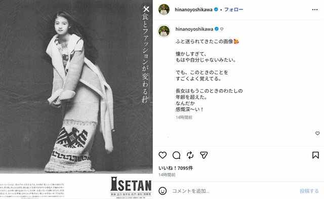 吉川ひなの、8年ぶり芸能活動再開で投稿の1993年13歳時写真が「時代を変えた1枚」沸騰 「かわいさが限界突破」 ピンズバNEWS編集部 2026.4.17 テレビ&ラジオ 女優 エンタメ (2/2ページ) 1ページ目から読む ■【画像】「時代を変えた1枚」吉川ひなの、デビュー当時の1993年写真が沸騰「かわいさが限界突破」 4月17日、8年ぶりの芸能活動再開を発表した吉川ひなの。吉川は13歳だった1993年に百貨店「伊勢丹」の広告が話題となって人気モデルとなったことで知られるが、活動再開の前日、4月16日には1993年当時の新聞広告の写真も投稿。《時代を変えた1枚だよね。素敵すぎる》《かわいさが限界突破してる》などと注目された。 この画像の記事を読む 1 2