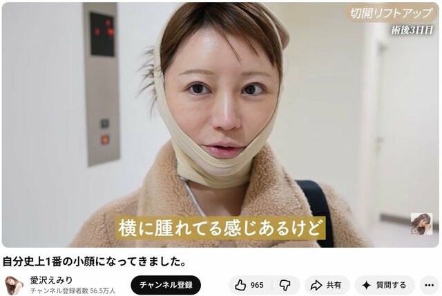 新宿歌舞伎町の元No.1キャバクラ嬢で実業家の愛沢えみり(37)が4月15日、YouTubeチャンネルを更新。フル切開リフトをしたと明かし、手術からダウンタイムまでを公開した。今回の整形費用の内訳は、フルフェイス132万円、ネックリフト66万円、全身麻酔22万円の合計220万円だと明かしている。