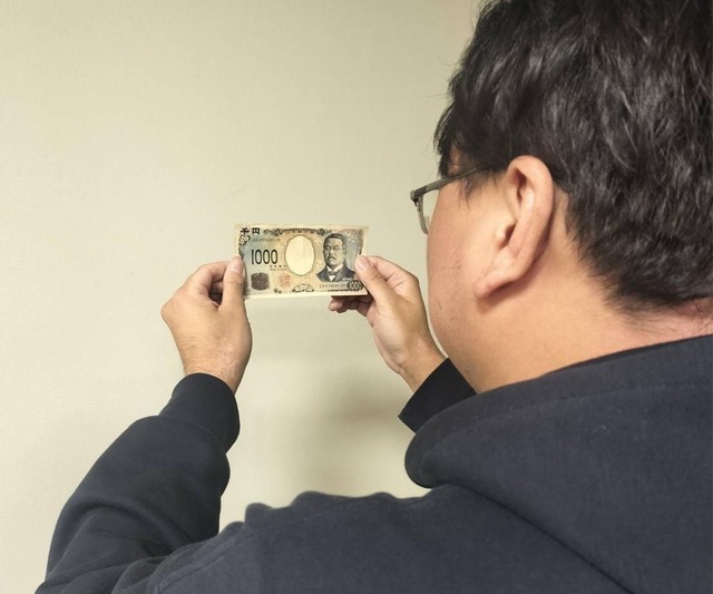 明るい場所で、両手で千円札を持つ。目から30センチほど離して、中央の透かしを見つめる。次に、透かしを見つめたまま、両手を少しずつ下げていく。