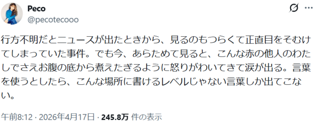 1児の母・peco、京都男児遺棄事件に「お腹の底から煮えたぎるように怒りが」感情露わ 心情投稿に広がる共感 ピンズバNEWS編集部 2026.4.18 エンタメ (2/2ページ) 1ページ目から読む ■【画像】「お腹の底から煮えたぎるように怒りが」京都男児遺棄事件に憤りのpeco、“パパ似”息子との2S 京都男児遺棄事件を受けて、《お腹の底から煮えたぎる》と悲痛な思いと怒りをあらわにした1児の母・peco。 ※画像はpecoのインスタグラムより ※画像はpecoのXより この画像の記事を読む 1 2