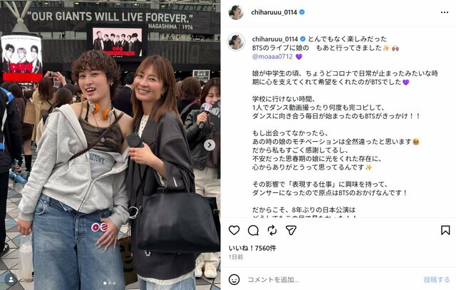 タレントの新山千春(45)が4月17日、インスタグラムを更新。東京ドームで開催されたBTSのワールドツアー『BTS WORLD TOUR ‘ARIRANG’ IN JAPAN』に、長女でダンサーの新山もあ(19)と参戦した際の母娘2ショットを公開すると、ファンからは《素敵な親子》《娘さん似てきましたね》といったコメントが寄せられた。