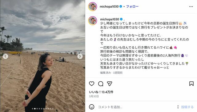 「ゴールデンウィークの予定」ランキング、"近場におでかけ"よりも多数派だったのは【トップ3】 ピンズバNEWS編集部 2026.4.23 ライフ (4/4ページ) 1ページ目から読む ■【画像】産前最後夫婦旅、第1子妊娠みちょぱ「顔つきが母」な笑顔 2月に妊娠を発表したみちょぱは、夫の大倉士門の誕生日旅行に行ってきたことを3月にインスタグラムで報告。バケーションを楽しむみちょぱの柔らかい表情に、フォロワーからは《顔つきが母》《幸せそう》など様々な声があがった。 みちょぱ 公式インスタグラムより この画像の記事を読む 1 2 3 4