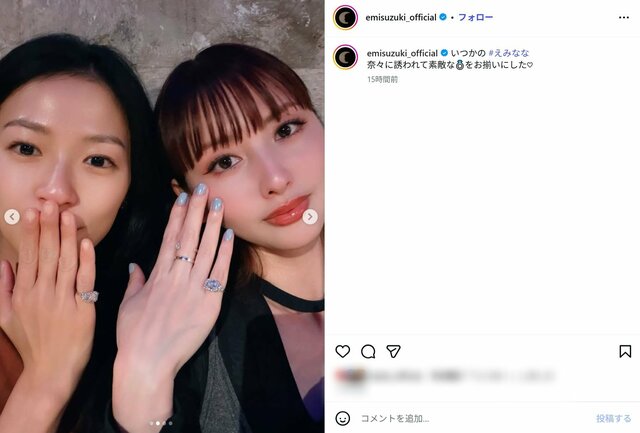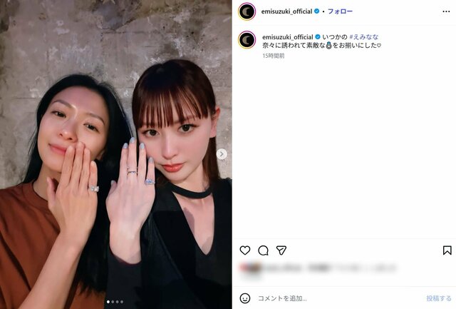 鈴木えみ、「お揃いの指輪は可愛すぎます」25年親友・大人気女優との2ショットが沸騰 「母みたい」と言われた過去も ピンズバNEWS編集部 2026.4.23 テレビ&ラジオ テレビドラマ 女優 俳優 (3/3ページ) 1ページ目から読む ■【画像】「お揃いの指輪は可愛すぎます」鈴木えみ、25年親友・大人気女優との“美貌スゴすぎ”2S 鈴木えみが、インスタグラムに25年来の親友・榮倉奈々とのツーショットをアップ。お揃いの指輪を購入下と報告すると、《えみななでお揃いの指輪は可愛すぎますわ》《宝石と同じくらい輝いてる》といったコメントが寄せられた。 ※画像は鈴木えみの公式インスタグラムより、以下同 この画像の記事を読む 1 2 3