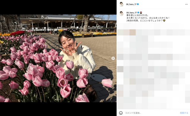 2025年12月23日に俳優・高杉真宙との結婚を発表した波瑠は今年3月、左薬指のリングが光る“春らんまんショット”を投稿している。