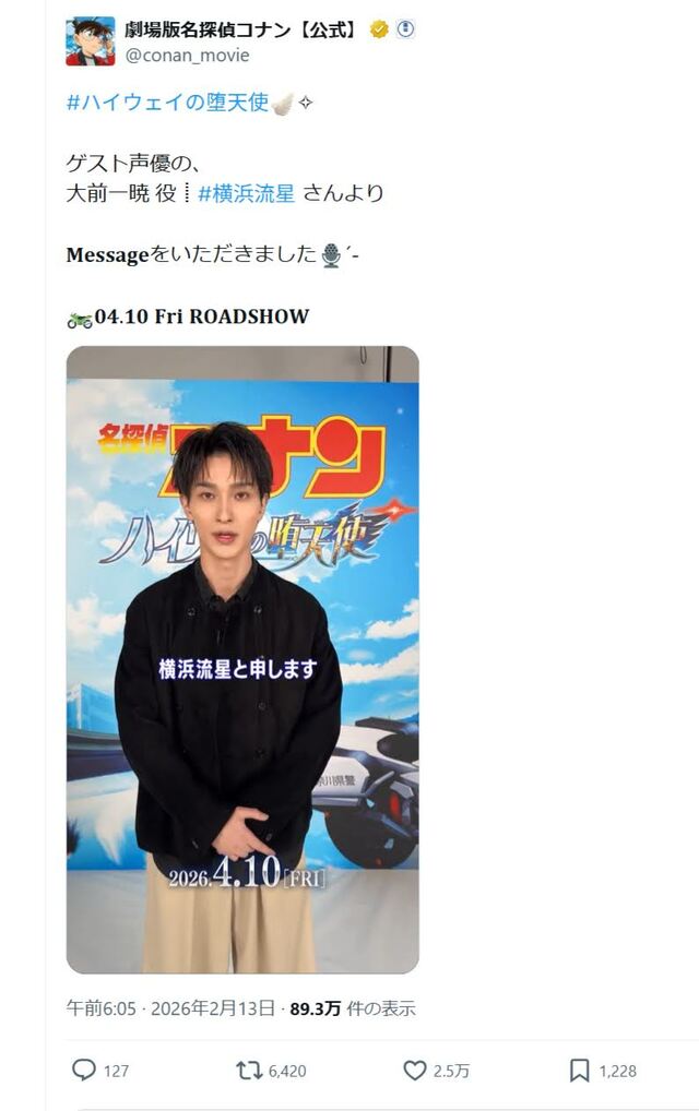 「『名探偵コナン』好きな劇場版」ランキング、『100万ドルの五稜星』を抑えた豪華コラボ作は【トップ3】 ピンズバNEWS編集部 2026.4.24 アニメ (4/4ページ) 1ページ目から読む ■【画像】『ハイウェイの堕天使』で声優を務めた横浜流星の爽やかビジュアル 横浜流星は『名探偵コナン』劇場版最新作『ハイウェイの堕天使』で声優を務めており、ファンからはSNSに《イケボ》と称賛の声があがっている。 劇場版名探偵コナン【公式】Xより この画像の記事を読む 1 2 3 4