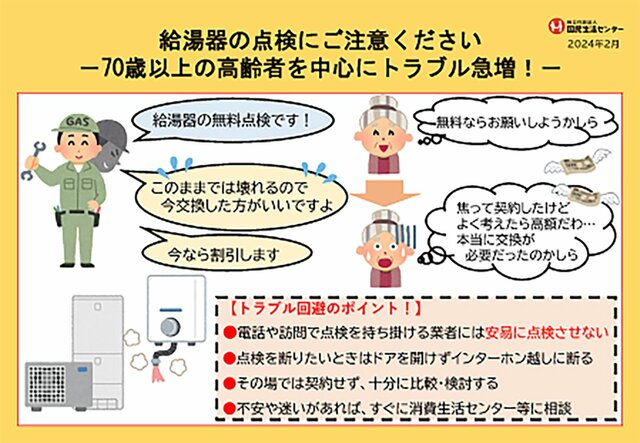 「給湯器が実質0円」のカラクリとは 補助金制度を悪用した「点検商法」に修理交換業者が怒りの告発 ピンズバNEWS編集部 2026.4.26 ライフ (3/3ページ) 1ページ目から読む ■【画像】詐欺かも……と思ったら、まずは消費生活センターに相談 国民生活センターでは、消費者からの相談を受け、校正な立場で処理に当たっている。まずは消費者ホットライン「188」(局番なし)で、お近くの消費者生活相談窓口を案内してもらおう。 画像は国民生活センターのホームページより この画像の記事を読む 1 2 3