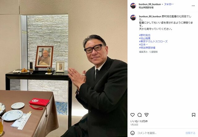 野村克也監督の七回忌に出席したことを報告する池山隆寛監督のインスタ写真。テーブルに置かれた真っ赤なスマホケースには、マスクマンらしきデザインが……。池山監督がプロレス好きだという情報は聞いたことがないが、年代的に隠れファンなのかもしれない。